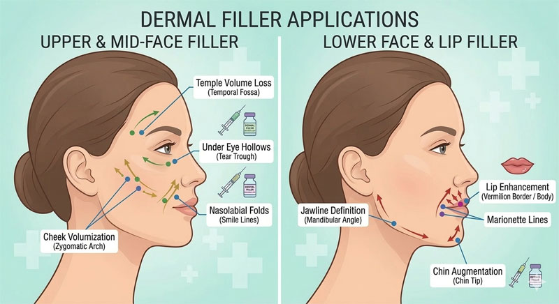 Filler treatments are commonly used for areas such as the cheeks, lips, under-eye hollows, jawline, chin, and nasolabial folds (lines from the nose to the mouth). The procedure is minimally invasive and usually completed within a short clinic visit.